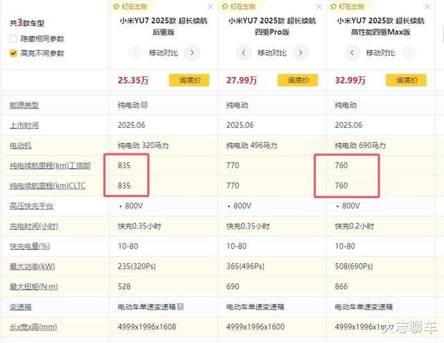 首先,官方的续航数据很难达成,你别看小米最低续航都有760公里,最高续航更是给弄到了835公里,看着续航很高的样子,可真实开,大部分车主都得打个折扣,平时开,最多也就是四五百这个水平,你也不可能把电池包的电用完再充吧,得留个10%左右,于是乎,你真正能用到的续航也就几百公里而已。