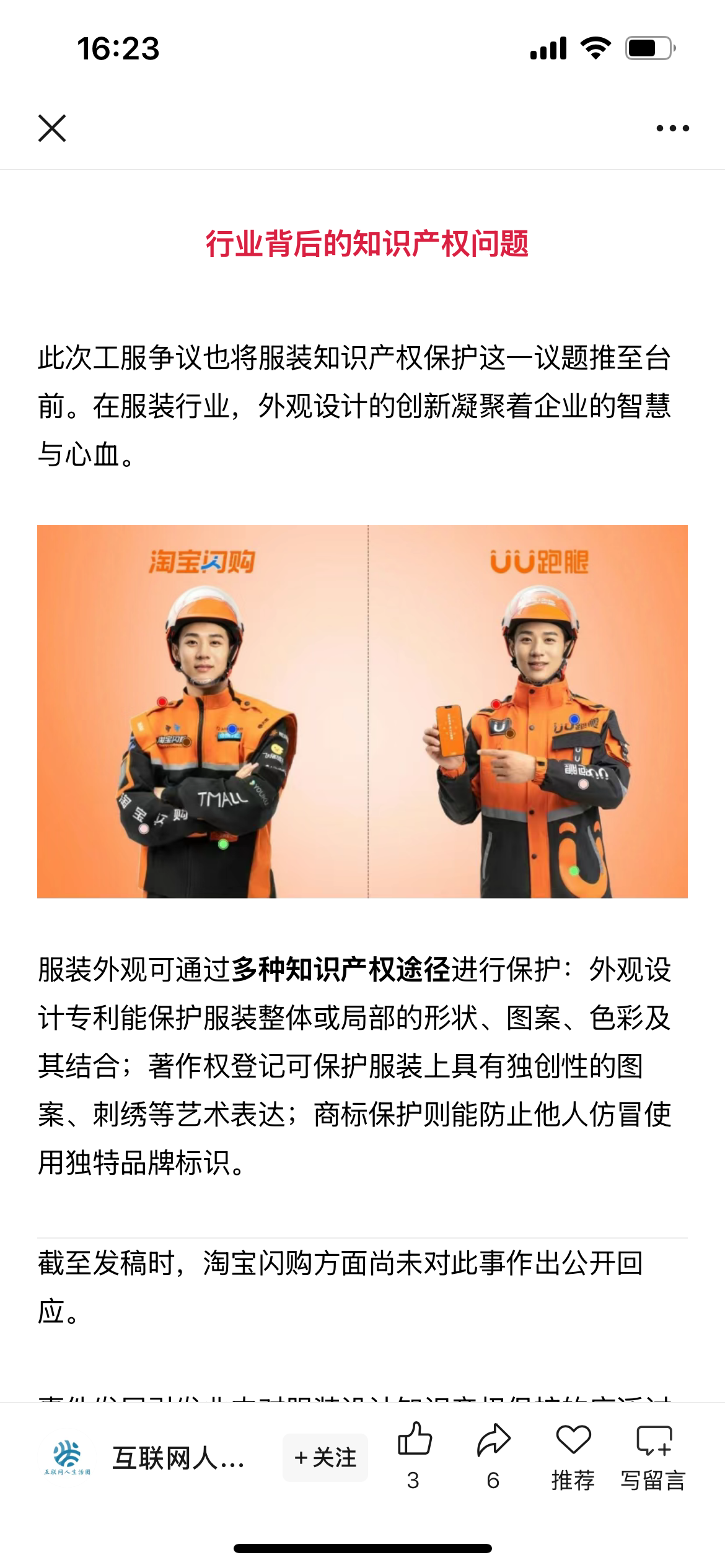 近日,淘宝闪购骑士服与UU跑腿疾风系列跑男工装“撞衫”,引发热议,登上热搜,牵扯出设计领域的知识产权、行业竞争等诸多深层次问题。
